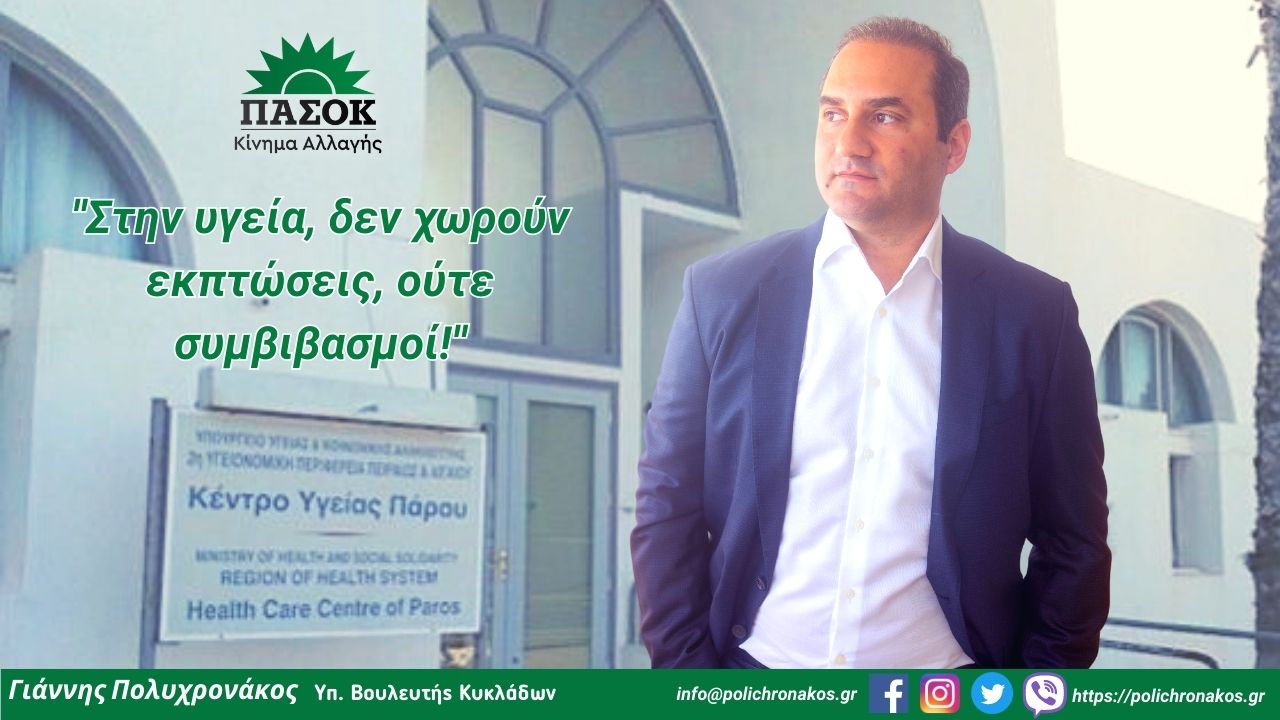 Τον προβληματισμό αλλά και την ανησυχία του για την κατάσταση στην οποία έχει περιέλθει ο τομέας της δημόσιας υγείας στη Πάρο εξέφρασε ο υπ. Βουλευτής του ΠΑΣΟΚ στις Κυκλάδες και αν. Τομεάρχης Νησιωτικής Πολιτικής κ. Γιάννης Πολυχρονάκος κατά τη διάρκεια της παραμονής του στο νησί.