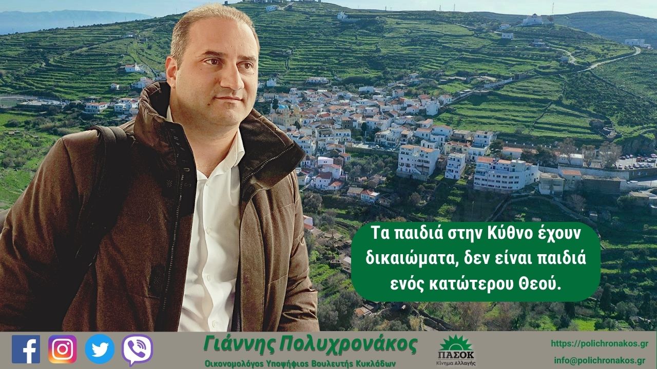 «Το πως αντιλαμβάνονται η κυβέρνηση και το Αθηνοκεντρικό Κράτος την έννοια της νησιωτικότητας, το επιβεβαίωσαν με την απόφαση τους να στείλουν τους μαθητές της Κύθνου να δώσουν πανελλήνιες εξετάσεις σε άλλο νησί», επισημαίνει ο υπ. Βουλευτής Κυκλάδων και αν. Τομεάρχης Νησιωτικής Πολιτικής ΠΑΣΟΚ κ. Γιάννης Πολυχρονάκος: