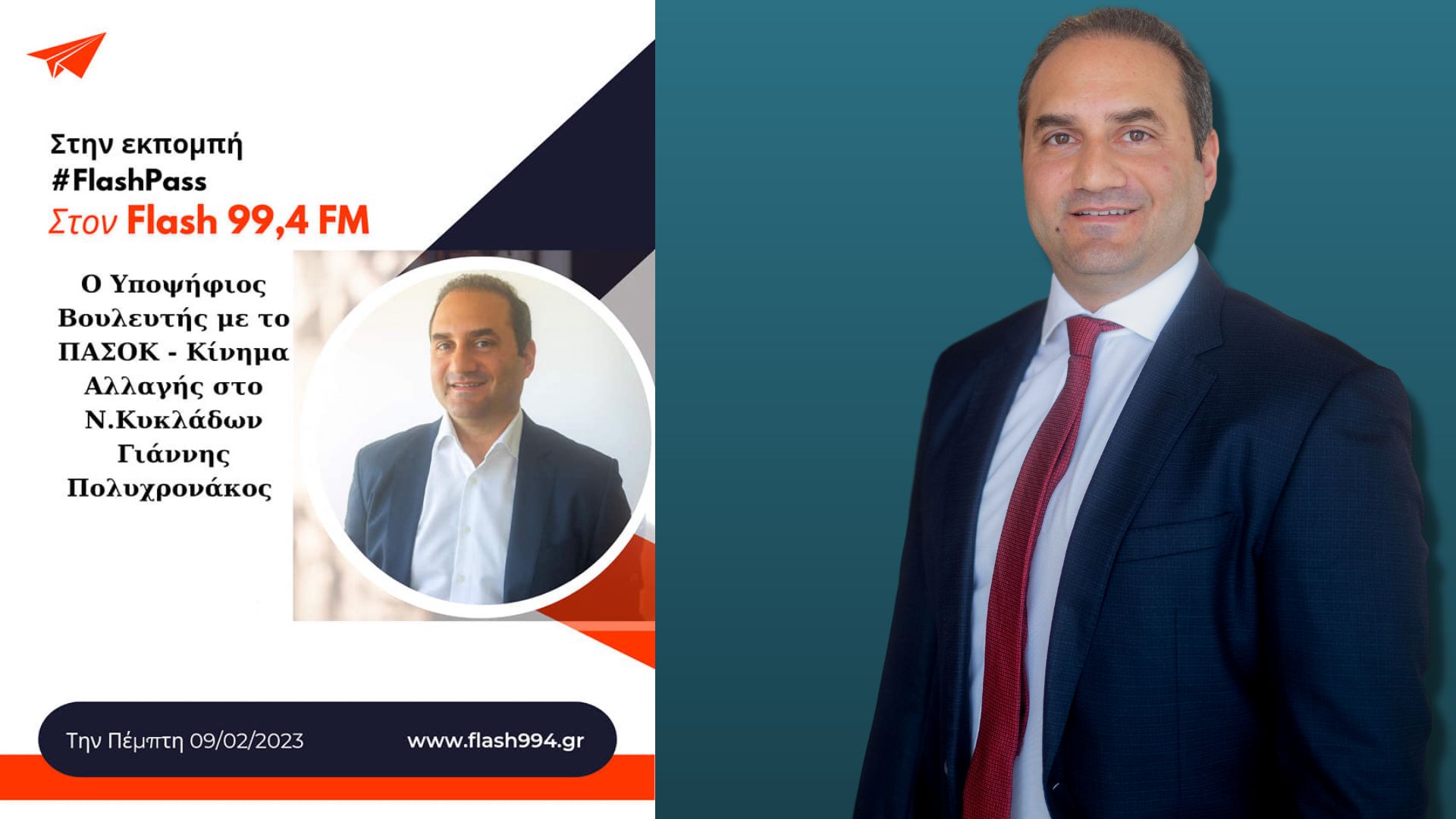 Συγκεκριμένες προτάσεις με όραμα, σχέδιο και στόχους κατέθεσε ο Υπ. Βουλευτής Κυκλάδων και Αν. Τομεάρχης Νησιωτικής Πολιτικής του ΠΑΣΟΚ, κ. Γιάννης Πολυχρονάκος, μιλώντας στην εκπομπή Flash Pass του Flash Radio 99,4.